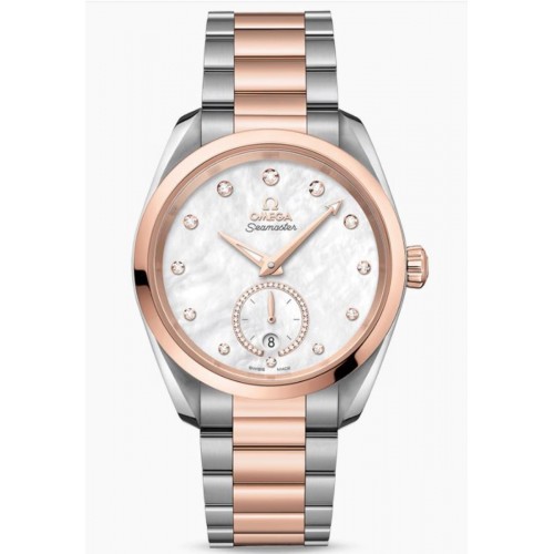 Omega Seamaster Aqua Terra 150m Master Co-Axial Mother of Pearl Dial Steel Women‘s Luxury Watch Model 220.20.38.20.55.002. Stainless Steel case with Two-Tone Stainless Steel Brushed and Polished watch band. Fixed Rose Gold bezel. Dial description: Rose Gold-tone luminous hands and Diamond hour markers with the Date and Small Seconds Displayed at the 6 o‘clock position on a White Pearled Mother of Pearl dial. Automatic - Chronometer movement. Calendar: Date at 6 o‘clock. Chronograph sub-dials display: Small Seconds. Powered by Omega Caliber 8802 engine with 55 hours power reserve. Watch functions: Date, Power Reserve, Hour, Minute, Second. Scratch Resistant Sapphire crystal. Round case shape. Case size: 38mm. Transparent case back. . Also known as model: 22020382055002.