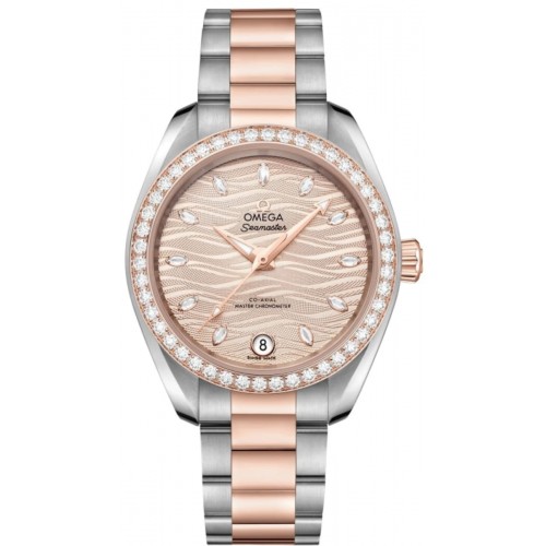 Omega Seamaster Aqua Terra 150m Master Co-Axial Grey Dial Diamond Steel and Rose Gold Women‘s Luxury Watch Model 220.25.34.20.59.001. Rose Gold & Stainless Steel case with Two-Tone Rose Gold & Stainless Steel Brushed and Polished watch band. Fixed Rose Gold Diamond Set bezel. Dial description: Rose Gold tone luminous hands and marquise-cut diamond hour markers on a grey wave-embossed dial. Automatic - Chronometer movement. Powered by Omega Caliber 8800 engine with 55 hours power reserve. Watch functions: Date, Power Reserve, Hour, Minute, Second. Scratch Resistant Sapphire crystal. Round case shape. Case size: 34mm. Transparent case back. . Also known as model: 22025342059001.
