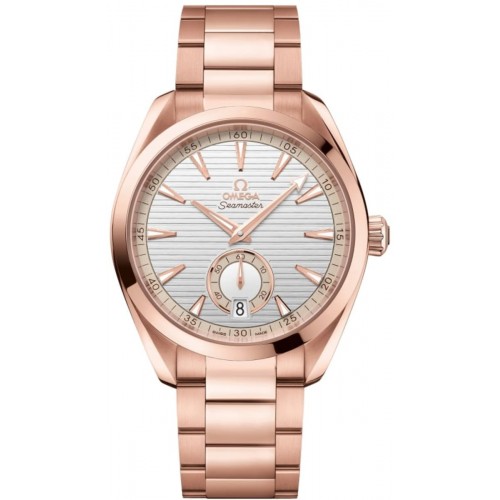 Omega Seamaster Aqua Terra 150m Master Co-Axial Silver Dial Rose Gold Men‘s Watch Model 220.50.41.21.02.002. Rose Gold case with Rose Gold Rose Gold Brushed and Polished watch band. Deployment with Push Button clasp. Fixed bezel. Dial description: Rose Gold Luminous filled hands and Index hour markers with minute markers around the outer rim and a small seconds sub-dial on a Horizontal Linear Textured Silver dial. Automatic - Chronometer movement. Calendar: Date at 6 o‘clock. Chronograph sub-dials display: Small Seconds. Powered by Omega Caliber 8917 engine with 60 hours power reserve. Watch functions: Date, Power Reserve, Hour, Minute, Second. Screw in crown. Scratch Resistant Sapphire crystal. Round case shape. Case size: 41mm. Case thickness: 13.2mm. Transparent case back. . Also known as model: 22050412102002.