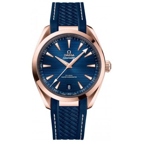 Omega Seamaster Aqua Terra 150m Master Co-Axial Chronometer 41 MM Blue Dial Blue Rubber Strap Men‘s Watch Model 220.52.41.21.03.001. 18Kt Rose Gold case with Blue Rubber strap. Deployment with Push Button clasp. Fixed bezel. Dial description: Rose Gold Luminous filled hands and Index hour markers with minute markers around the outer rim on a Horizontal Linear Textured Blue dial. Automatic - Chronometer movement. Powered by Omega Caliber 8900 engine with 60 hours power reserve. Watch functions: Date, Power Reserve, Hour, Minute, Second. Screw in crown. Scratch Resistant Sapphire crystal. Case size: 41mm. Case thickness: 13.2mm. Transparent case back. . Also known as model: 22052412103001.