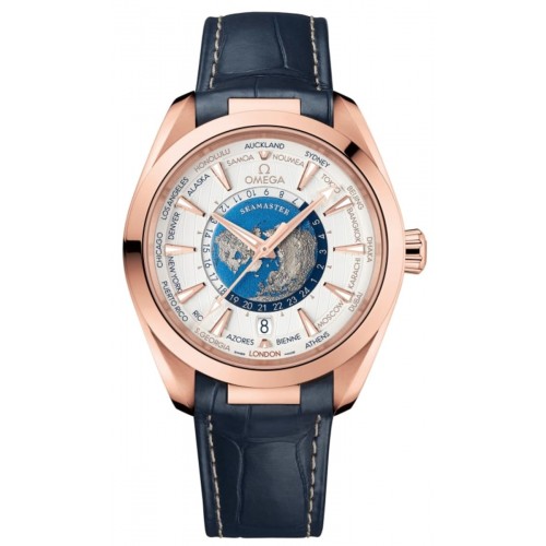 Omega Seamaster Aqua Terra 150m Master Co-Axial Chronometer GMT Worldtimer Silver Dial Leather Strap Men‘s Watch Model 220.53.43.22.02.001. 18Kt Rose Gold case with Blue Alligator Leather strap. Deployment with Push Button and Foldover clasp. Fixed bezel. Dial description: Rose Gold Tone Luminous hands and Index hour markers with a Worldtimer on a Silver dial. Automatic - Chronometer movement. Powered by Omega Calibre 8939 engine with 60 hours power reserve. Watch functions: Date, Power Reserve, Hour, Minute, Second, GMT, 24 Hour. Screw in crown. Scratch Resistant Sapphire crystal. Case size: 43mm. Case thickness: 14.3mm. Transparent case back. . Also known as model: 22053432202001.