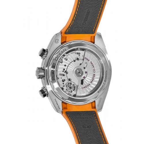 Omega Seamaster Planet Ocean 600M Chronograph 45.5mm Automatic Black & Orange Bezel Rubber Strap Men‘s Watch Model 215.32.46.51.01.001. Stainless Steel case with Black Rubber with Orange Stitching strap. Folding clasp. Uni-Directional bezel. Dial description: Silver tone luminous hands and Index hour markers with minute markers around the outer rim and 2 Sub-dials on a Black dial. Automatic-Chronograph movement. Calendar: Date at 6 o‘clock. Chronograph sub-dials display: 60 Second, 12 Hours. Powered by Omega Caliber 9900 engine with 60 hours power reserve. Watch functions: Date, Power Reserve, Hour, Minute, Second, Chronograph. Screw Down crown. Scratch Resistant Sapphire crystal. Round case shape. Case size: 45.5mm. Transparent case back. . Also known as model: 21532465101001, 215-32-46-51-01-001, O21532465101001.