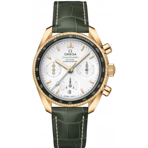 Omega Speedmaster Co-Axial Chronometer Chronograph 38mm Silver Dial Yellow Gold Leather Strap Women‘s Watch Model 324.63.38.50.02.004. 18K Yellow Gold case with Green Leather strap. Deployment with Foldover clasp. Tachymeter Scale bezel. Dial description: 18K Yellow Gold hands and Index hour markers with minute markers around the outer rim and 3 sub-dials on a Silver dial. Automatic Chronometer Chronograph movement. Calendar: Date at 6 o‘clock. Chronograph sub-dials display: 60 Second, 30 Minute, 12 Hours. Powered by Omega Calibre 3330 engine with 52 hours power reserve. Watch functions: Date, Power Reserve, Hour, Minute, Second, Chronograph. Scratch Resistant Sapphire crystal. Round case shape. Case size: 38mm. Solid case back. . Also known as model: 32463385002004.