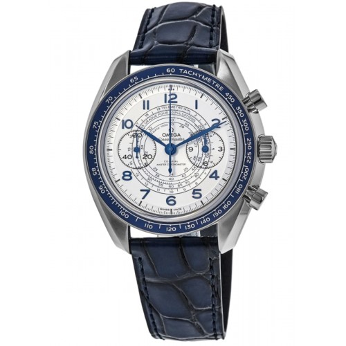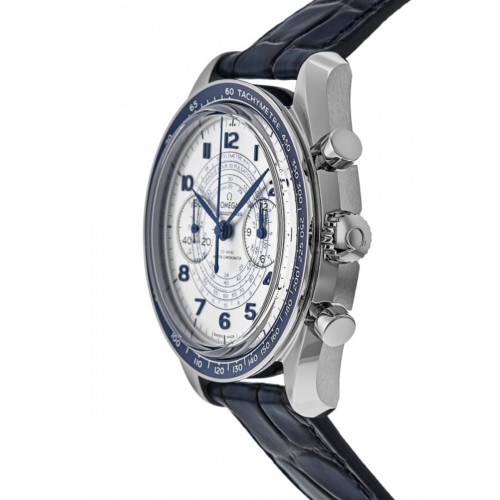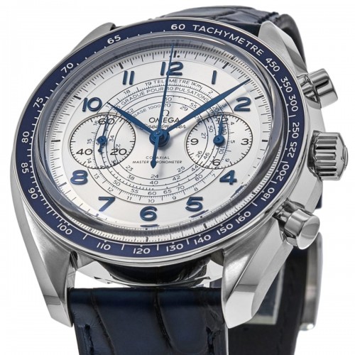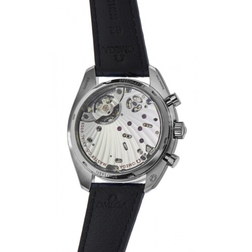 Omega Speedmaster Chronoscope Co-Axial Master Chronometer Chronograph 43 mm Silver Dial Leather Strap Men‘s Watch Model 329.33.43.51.02.001. Stainless Steel case with Blue Leather strap. Tang clasp. Dial description: Blue hands and Arabic Numeral hour markers with minute markers around the outer rim and 2 sub-dials on a Silver dial. Automatic movement. Chronograph sub-dials display: Small Seconds, 12 Hours. Powered by Omega Calibre 9908 engine with 60 hours power reserve. Watch functions: Hour, Minute, Second, Chronograph, Power Reserve. Scratch Resistant Sapphire crystal. Round case shape. Case size: 43mm. Transparent case back. . Also known as model: 32933435102001.