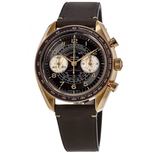 Omega Speedmaster Chronoscope Co-Axial Master Chronometer Chronograph 43 mm Brown Dial Leather Strap Men‘s Watch Model 329.92.43.51.10.001. Bronze Gold case with Brown Leather strap. Tang clasp. Dial description: Rose Gold tone hands and Arabic Numeral hour markers with minute markers around the outer rim and 2 sub-dials on a Brown dial. Manual Wind movement. Chronograph sub-dials display: 12 Hours, Small Seconds. Powered by Omega Calbre 9908 engine with 60 hours power reserve. Watch functions: Hour, Minute, Second, Chronograph, Power Reserve. Scratch Resistant Sapphire crystal. Round case shape. Case size: 43mm. Transparent case back. . Also known as model: 32992435110001.