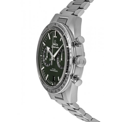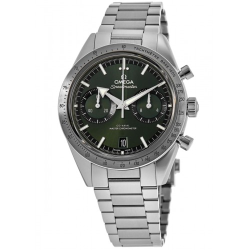 Omega Speedmaster ‘57 Co-Axial Master Chronometer Chronograph 40.5 mm Green Dial Steel Men‘s Watch Model 332.10.41.51.10.001. Stainless Steel case with Stainless Steel watch band. Deployment with Foldover clasp. Dial description: Silver tone hands and Index hour markers with minute markers around the outer rim and 2 sub-dials on a Green dial. Manual Wind movement. Calendar: Date at 6 o‘clock. Chronograph sub-dials display: 60 Second, 12 Hours. Powered by Omega Calibre 9906 engine with 60 hours power reserve. Watch functions: Date, Power Reserve, Hour, Minute, Second, Chronograph. Scratch Resistant Sapphire crystal. Round case shape. Case size: 40.5mm. Transparent case back. . Also known as model: 33210415110001.