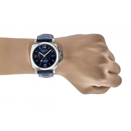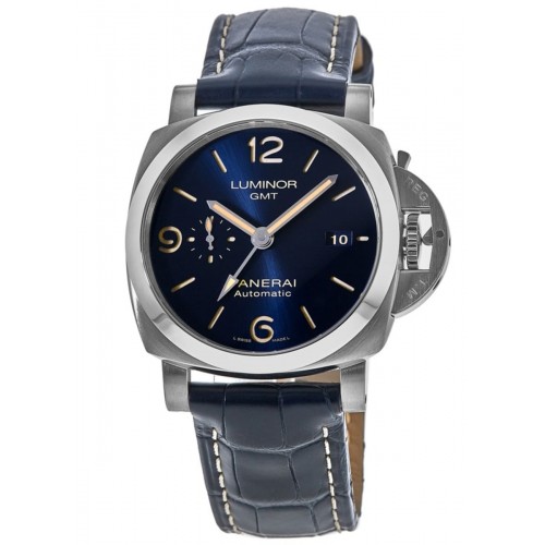 Panerai Luminor 1950 GMT Automatic Blue Dial Men‘s Watch Model PAM01033. Stainless Steel case with Blue Alligator Leather strap. Tang clasp. Fixed bezel. Dial description: Rose Gold Luminescent Hands and Arabic Numerals/Index hour Markers, Date Displayed at 3, with a 60 Second Sub-dial on a Blue Dial. dial. Automatic movement. Calendar: Date at 3 o‘clock. Chronograph sub-dials display: 60 Second. Powered by Panerai Calibre P.9011 engine with 72 hours power reserve. Watch functions: Date, Power Reserve, Hour, Minute, Second, GMT. Scratch Resistant Sapphire crystal. Round case shape. Case size: 44mm. 300 Meters - 990 Feet water resistant. 2 year . Also known as model: PAM01033.