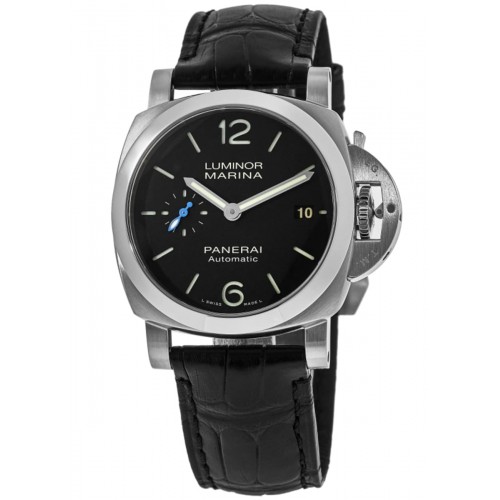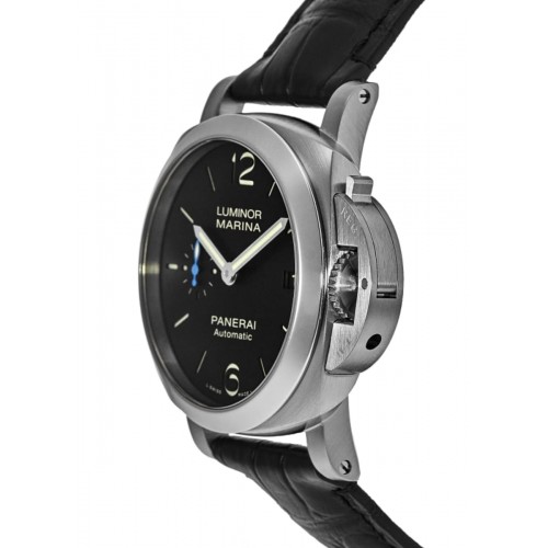 Panerai Luminor Marina Black Dial Leather Strap Men‘s Watch Model PAM01272. Stainless Steel case with Black Leather Alligator strap. Stainless Steel bezel. Dial description: Luminous Hands and Index/Arabic Numeral Hour Markers with one Sub dial and the Date displayed at the 3 o‘clock position on a Black dial. Automatic movement. Calendar: Date at 3 o‘clock. Chronograph sub-dials display: Small Seconds. 72 hours power reserve. Watch functions: Date, Power Reserve, Hour, Minute, Second. Round case shape. Case size: 40mm. Solid case back. .