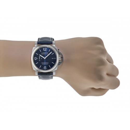Panerai Luminor Marina Automatic 44mm Blue Dial Men‘s Watch Model PAM01313. Stainless Steel case with Blue Alligator Leather strap. Tang clasp. Fixed bezel. Dial description: Silver tone hands and Arabic Numeral/Index hour markers with a small seconds sub-dial on a Blue dial. Automatic movement. Calendar: Date at 3 o‘clock. Chronograph sub-dials display: Small Seconds. Powered by Panerai Calibre P.9010 engine with 72 hours power reserve. Watch functions: Date, Power Reserve, Hour, Minute, Second. Pull/Push crown. Scratch Resistant Sapphire crystal. Round case shape. Case size: 44mm. Case thickness: 14mm. Solid case back. .