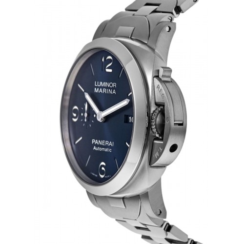 Panerai Luminor Marina Blue Dial Steel Men‘s Watch Model PAM01316. Brushed Stainless Steel case with Stainless Steel watch band. Dial description: Silver tone hands and Arabic Numeral/Index hour markers with a small seconds sub-dial on a Blue dial. Automatic movement. Calendar: Date at 3 o‘clock. Chronograph sub-dials display: Small Seconds. Powered by Panerai Calibre P.9010 engine with 72 hours power reserve. Watch functions: Date, Power Reserve, Hour, Minute, Second. Scratch Resistant Sapphire crystal. Round case shape. Case size: 44mm. Case thickness: 14mm. 300 Meters - 990 Feet water resistant. 2 year .