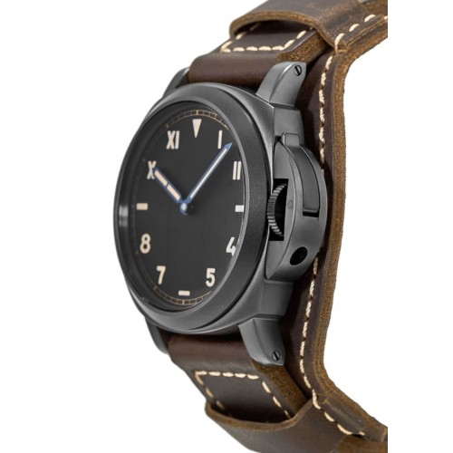 Panerai Luminor California 8 Days DLC 44mm Titanium Men‘s Watch Model PAM00779. Titanium Brushed case with Brown Leather strap. Tang clasp. Fixed bezel. Dial description: Rose Gold and Blue Hands with Roman Numeral and Arabic Hour Markers on a Black dial. Black dial. Manual Winding movement. 72 hours power reserve. Watch functions: Hour, Minute. Scratch Resistant Sapphire crystal. Cushion case shape. Case size: 44mm. Solid case back. .