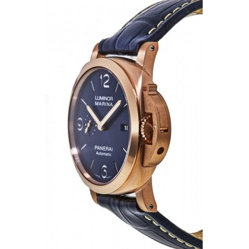 Panerai Luminor Marina 18kt Rose Gold 44mm Blue Dial Men‘s Watch Model PAM01112. Rose Gold case with Blue Alligator Leather strap. Dial description: Rose Gold tone Hands and Arabic Numeral/Index Hour Markers with a seconds sub-dial on a Blue dial. Automatic movement. Calendar: Date at 3 o‘clock. Chronograph sub-dials display: Small Seconds. Powered by Panerai Calibre P.9010 engine with 72 hours power reserve. Watch functions: Date, Power Reserve, Hour, Minute, Second. Scratch Resistant Sapphire crystal. Round case shape. Case size: 44mm. 50 Meters - 165 Feet water resistant. 2 year .