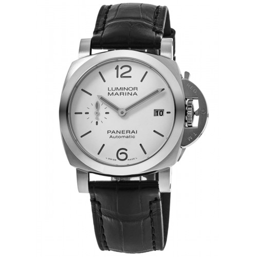 Panerai Luminor Quaranta White Dial Leather Strap Men‘s Watch Model PAM01371. Stainless Steel case with Black Alligator Leather strap. Automatic movement. Calendar: Date at 3 o‘clock. Chronograph sub-dials display: Small Seconds. Powered by Panerai Calibre P.900 engine with 72 hours power reserve. Watch functions: Date, Hour, Minute, Second. Round case shape. Case size: 40mm. Solid case back. .