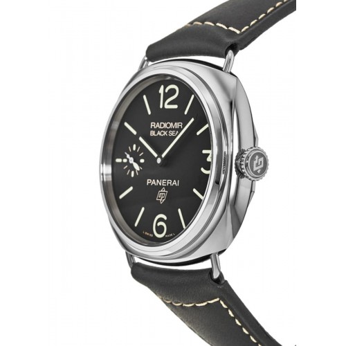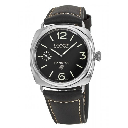 Panerai Radiomir Black Seal Logo Hand Wind Men‘s Fashion Watch Model PAM00754. AISI 316L Polished Steel case with Black Calfskin Leather strap. Polished Stainless Steel Tang clasp. Fixed bezel. Dial description: Black with Luminous Arabic and Roman Numerals and Hour markers dial. Automatic Self Winding movement. Chronograph sub-dials display: Small Seconds. Powered by Calibre P.6000 engine with 72 hours power reserve. Watch functions: Hour, Minute, Second. Screw Down crown. Scratch Resistant Sapphire crystal. Square case shape. Case size: 45mm. Solid case back. .