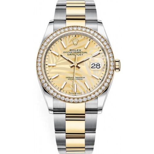 Rolex Datejust 36 Yellow Gold & Diamonds Golden Palm-Motif Dial Women‘s Luxury Watch Model M126283RBR-0024. Stainless Steel Case and 18kt Yellow Gold Diamond-set Bezel. case with Stainless Steel and 18kt Yellow Gold Oyster Style Bracelet. watch band. Oysterclasp clasp. Fixed- Diamond Set bezel. Dial description: Luminescent Yellow Gold Hands and Stick Hour Markers, With the Date Displayed at 3, on a Golden Palm-Motif Dial. dial. Automatic - Chronometer movement. Powered by Rolex Calibre 3235 engine with 70 hours power reserve. Watch functions: Date, Power Reserve, Hour, Minute, Second. Screw in crown. Scratch Resistant Sapphire crystal. Round case shape. Case size: 36mm. Solid case back. .
