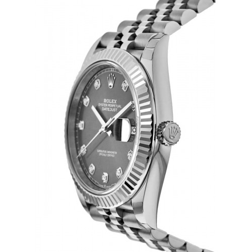 Rolex Datejust 41 Steel & White Gold Rhodium Diamond Dial Fluted Bezel Men‘s Luxury Watch Model M126334-0006. White Gold & Stainless Steel Polished case with Silver Stainless Steel Brushed and Polished watch band. Crownclasp clasp. Fixed-Fluted bezel. Dial description: Dark rhodium set with diamonds dial. Automatic - Chronometer movement. Powered by Rolex Calibre 3235 engine with 70 hours power reserve. Watch functions: Date, Power Reserve, Hour, Minute, Second. Screw down crown. Scratch Resistant Sapphire crystal. Case size: 41mm. Solid case back. . Also known as model: 126334-0006.