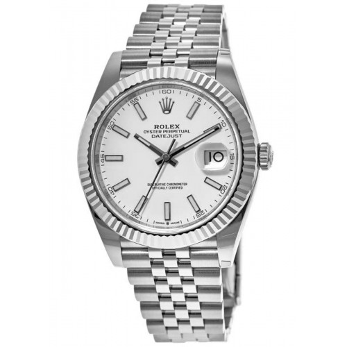 Rolex Datejust 41 Steel & White Gold White Dial Jubilee Bracelet Men‘s Watch Model M126334-0010. Polished Stainless Steel case with Stainless Steel Jubilee Style watch band. Oysterclasp clasp. Fixed bezel. Dial description: Luminescent Silver-tone Hands and Index Hour Markers, With the Date Displayed at 3, on White Dial. dial. Automatic - Chronometer movement. Powered by Rolex Calibre 3235 engine with 70 hours power reserve. Watch functions: Date, Power Reserve, Hour, Minute, Second. Screw in crown. Scratch Resistant Sapphire crystal. Round case shape. Case size: 41mm. Solid case back. . Elevate your wrist game with the Rolex Datejust 41 in Steel & White Gold. This iconic watch combines timeless elegance with modern sophistication, designed to last a lifetime.\r\nIts polished stainless steel case pairs effortlessly with the exquisite Jubilee-style stainless steel band. The fixed bezel and the luminescent silver-tone hands and index hour markers radiate class, while the date display at 3 adds functionality to this elegant piece.\r\n Also known as model: 126334 White Index Jubilee.