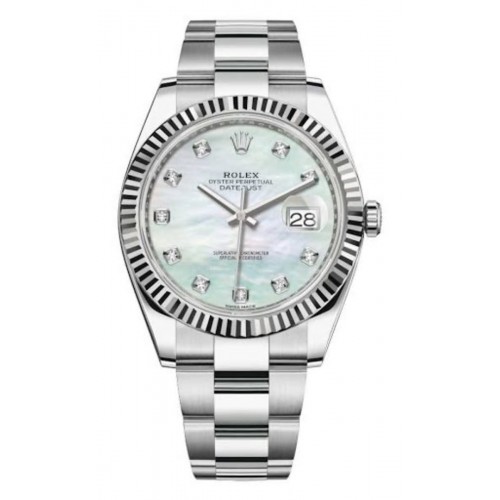 Rolex Datejust 41 Stainless Steel Mother of Pearl Diamond Dial Men‘s Luxury Watch Model M126334-0019. Polished Stainless Steel Case With a 18kt White Gold Fluted Bezel. case with Stainless Steel Oyster Style Bracelet watch band. Oysterclasp clasp. Fixed-Fluted bezel. Dial description: Polished Silver Hands and Diamond Hour Markers, With the Date Displayed, on a White Mother of Pearl Dial. dial. Automatic - Chronometer movement. Powered by Rolex Calibre 3235 engine with 70 hours power reserve. Watch functions: Date, Power Reserve, Hour, Minute, Second. Screw down crown. Scratch Resistant Sapphire crystal. Round case shape. Case size: 41mm. Solid case back. . The Rolex Datejust 41 Stainless Steel Mother of Pearl Diamond Dial Men‘s Watch is an exquisite luxury watch that offers precision and reliability at its best. This watch boasts a polished stainless steel case with an 18kt white gold fluted bezel, adding an extra touch of luxury to its design. The watch features a stunning white/green mother of pearl dial, which is adorned with diamond hour markers and polished silver hands, creating a look that is both sophisticated and timeless.\r\nPowered by the Rolex Calibre 3235 engine, this watch provides unparalleled precision and reliability. With an automatic-chronometer movement and a power reserve of up to 70 hours, you can be sure that this watch will keep accurate time even after several days of continuous use.\r\nThis classic timepiece is also highly versatile and durable, making it suitable for a range of activities. It is water-resistant up to 100 meters (330 feet), which means you can wear it while swimming, snorkeling, or even diving. The watch is equipped with a scratch-resistant sapphire crystal, ensuring that it can withstand even the toughest conditions.\r\nThis is an exceptional luxury watch that offers unparalleled precision, reliability, and durability. Its timeless design, automatic-chronometer movement, and scratch-resistant sapphire crystal make it a must-have for any watch enthusiast.\r\n Also known as model: 126334 MOP Diamond Oyster.