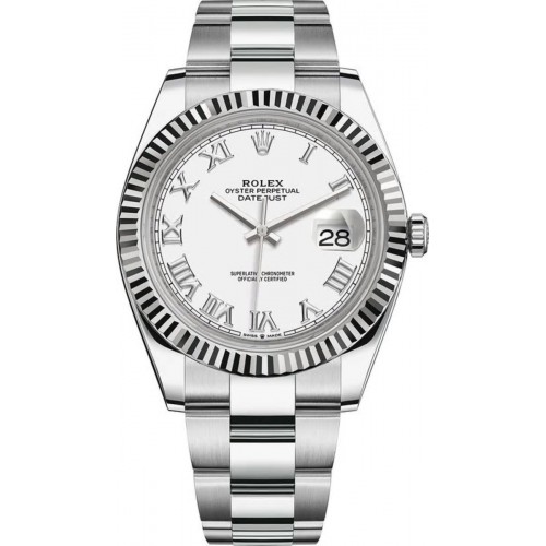 Rolex Datejust 41 Stainless Steel White Roman Dial Men‘s Luxury Watch Model M126334-0023. Polished Stainless Steel case with Stainless Steel Oyster Style Bracelet watch band. Oysterclasp clasp. Fixed-Fluted bezel. Dial description: Polished White Gold Hands and Roman Numeral Hour Markers, With the Date Displayed at 3, on White Dial. dial. Automatic - Chronometer movement. Powered by Rolex Calibre 3235 engine with 70 hours power reserve. Watch functions: Date, Power Reserve, Hour, Minute, Second. Screw in crown. Scratch Resistant Sapphire crystal. Round case shape. Case size: 41mm. Solid case back. . Also known as model: 126334 White Roman Oyster.