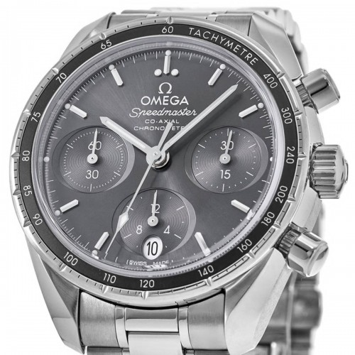 Omega Speedmaster Co-Axial Chronograph 38mm Grey Dial Steel Unisex Watch Model 324.30.38.50.06.001. Stainless Steel case with Silver Stainless Steel Brushed and Polished watch band. Deployment with Push Button clasp. Fixed bezel. Dial description: Rhodium Plated hands and index hour markers with 3 sub-dials on a Sunray Grey dial. Automatic - Chronometer movement. Calendar: Date at 6 o‘clock. Chronograph sub-dials display: Small Seconds, 30 Minute, 12 Hours. Powered by Omega Caliber 3330 engine with 52 hours power reserve. Watch functions: Date, Power Reserve, Hour, Minute, Second, Chronograph. Screw in crown. Scratch Resistant Sapphire crystal. Case size: 38mm. Solid case back. . Also known as model: 32430385006001.