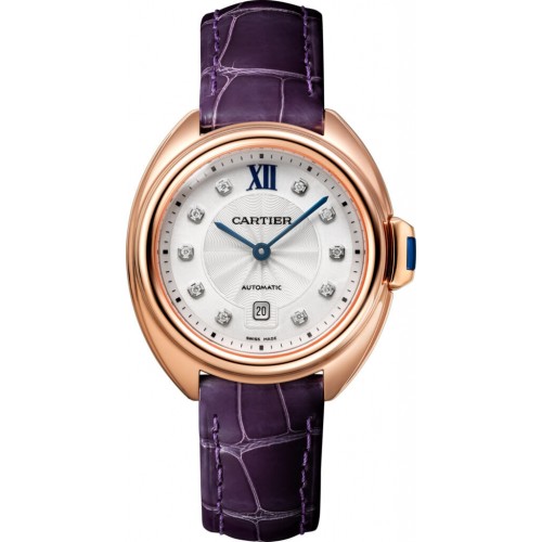 Cle de Cartier watch, 31 mm, self-winding mechanical movement. 18K pink gold case, diameter: 31 mm, thickness: 11.04 mm, key set with a sapphire, flinque sunray effect dial, set with 10 brilliant-cut diamonds, blued-steel sword-shaped hands, shiny aubergine alligator skin strap, 18K pink gold ardillon buckle. Original watches's Water-resistant to 3 bar (approx. 30 meters/100 feet).
