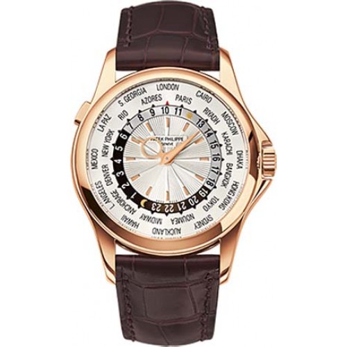 18kt rose gold case with a brown leather strap. Fixed rose gold bezel. Silver dial with rose gold-tone hands and index hour markers. Dial Type: Analog. Mechanical movement. 240 HU engine. Scratch resistant sapphire crystal. Transparent sapphire case back. Case diameter: 39.5 mm. Round case shape. Fold over clasp. Water resistant at 30 meters / 100 feet. Functions: GMT, world time, 24 hours, second time zone, hour, minute, second, day and night indicator. Luxury watch style. Watch label: Swiss Made. Patek Philippe Complications Mechanical Silver Dial Leather Men's Watch 5130R-018.