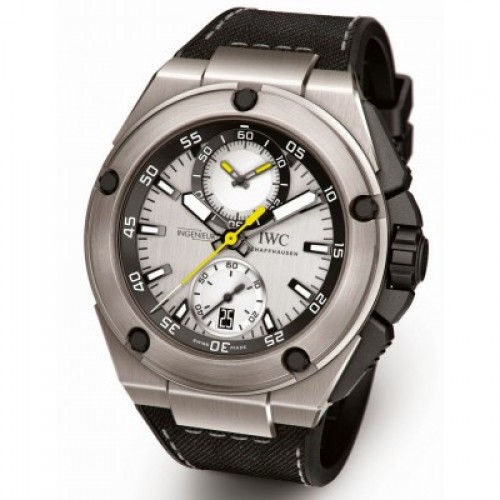 Titanium 45.1mm case. Silver dial, luminescent stick hour markers with yellow accent. Silver sub-dials wit Titanium bezel. Titanium crown. Black rubber with embossed calfskin inlay with titanium buckle. Automatic movement. Hours, minutes, seconds, date, flyback chronograph, stopwatch, hour and minute counters, tachymeter around the flange. Power reserve up to 44 hours. Water resistant up to 120 meters / 400 feet.